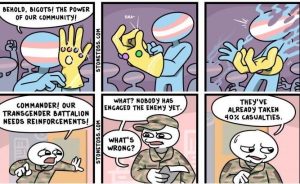 Hack Stone is not about to beat a dead Honorary Chief Petty Officer/Kamikaze pilot into the ground, everyone here has said they are non-deployable, so someone else gets to deploy, again. But what is the return on investment when recruiting transgender people. They can’t deploy, as mentioned. But have your junk removed isn’t as easy as getting a haircut during lunch. Psychological/Psychiatric examinations, hormone therapy, pre and post operation appointments, and ensuing follow on treatment for psychiatric and hormone stability. How much time and money is that? And when exactly do they attend their MOS school? So what is their time in the fleet? Just look at the advantages and disadvantages of allowing transgender troops to serve. Hack Stone can think of one item that is a positive. Please enlighten us, Commissar.