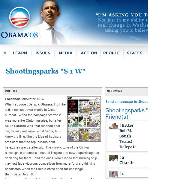 But this fellow, ShootingSparks, goes on to indict the entire Little Green Footballs network as some sort of grand Zionist scheme to take over the world. Not a big leap for most Paulistas, I’m sure. But Charles Johnson did a bit more digging and found ShootingSparks’ My Obama page.