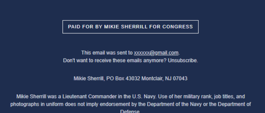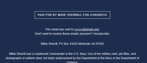 The designation was included in a disclaimer routinely appended to the bottom of Sherrill’s campaign emails.
