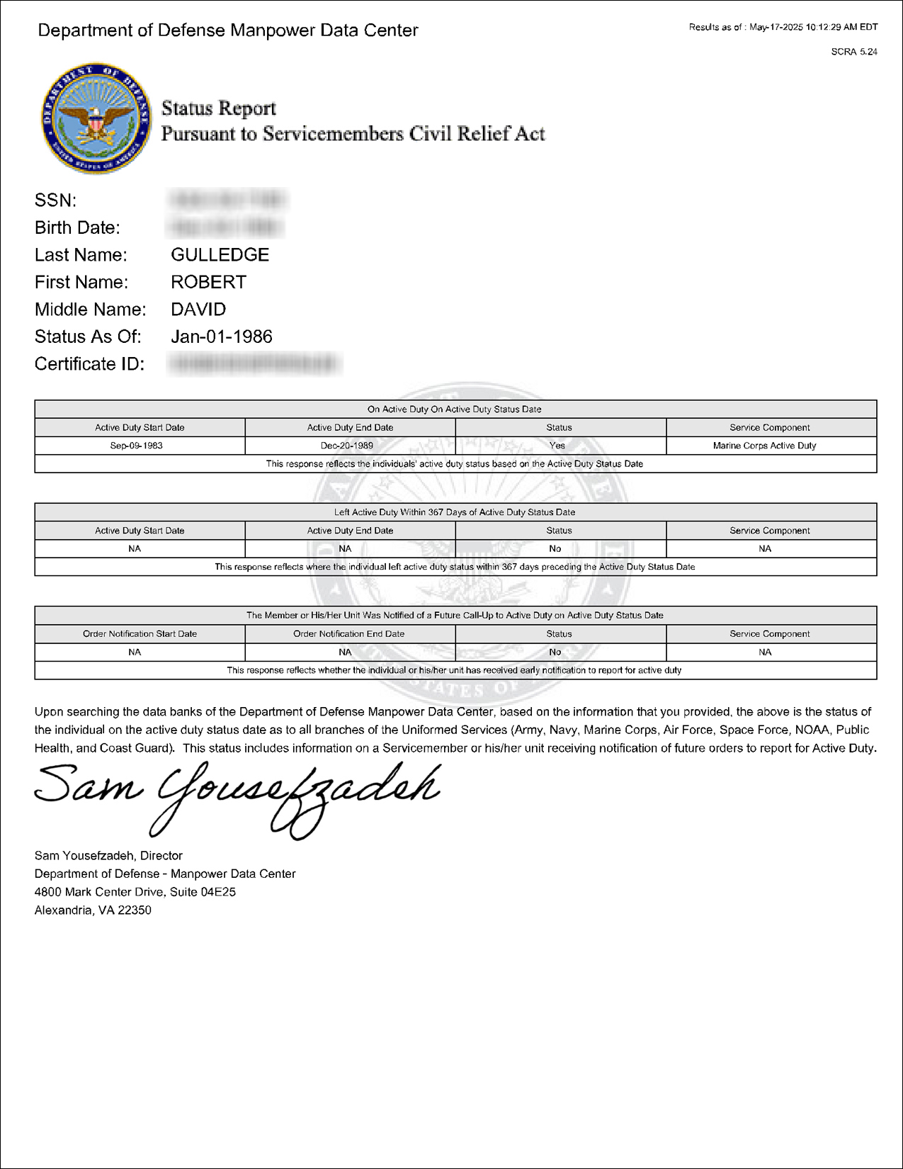 According to prosecutors, Gulledge used these fraudulent documents at least 10 times over 15 years to secure employment and veterans’ benefits, including a 2023 application for a State Department contract position and a 2019 application for VA disability benefits.