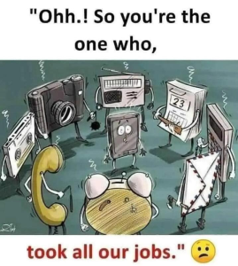 Great Sunday cartoons.”So your the one that took all our jobs” cartoon showing calenders, dial phone, mechanical alarm clock, tape cassets, film camera, portable small am/fm radio, mailing envelopes, Left out is my portable Smith Corona Galaxy model typewriter and mechanical check writer.