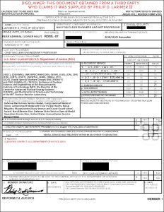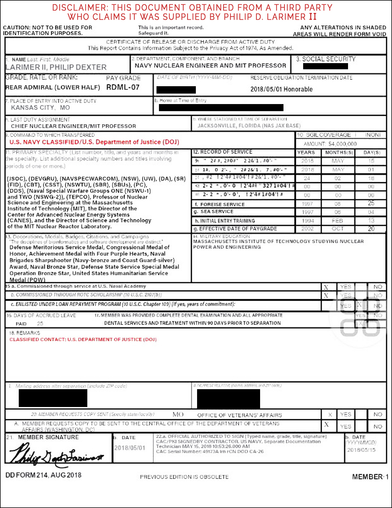 In a legal dispute over an insurance claim, USAA wrote Mr. Larimer a letter indicating several issues related to his eligibility, as well as the DD-214 that he provided, allegedly the same one supplied above. USAA only serves people connected with the military and their relatives.