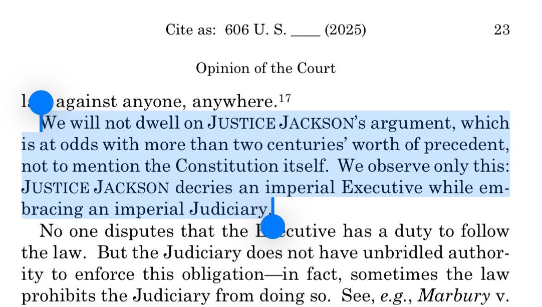 “The majority holds that, absent cumbersome class-action litigation, courts cannot completely enjoin even such plainly unlawful policies unless doing so is necessary to afford the formal parties complete relief,” she added. “That holding renders constitutional guarantees meaningful in name only for any individuals who are not parties to a lawsuit. Because I will not be complicit in so grave an attack on our system of law, I dissent.”