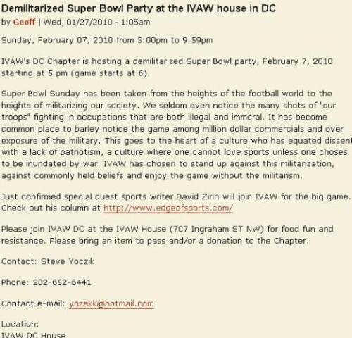 Man, these IVAW members hate everything that is fun. “Hey comrade, let’s take the best eating, drinking, and sports day of the year and make it a political fuck fest!”