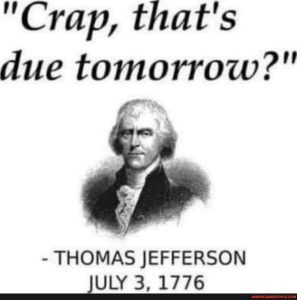 We all know (or should know) the 1776 timeline – the Declaration was approved by 12 of the 13 colonies on July 2, adopted by the Second Continenal Congress July 4, the approved version printed 249 years ago today on July 5th. On July 14th Congress ordered the Declaration be engrossed (writ in large hand on parchment, presumably by Thomas Matlock)) and it was this copy which was signed by the signers on August 2nd. Not all 56 signers were present on the second, and at least one never actually signed the original copy (Robert R. Livingstone of New York.) All, in the eyes of the King, were committing a capital crime by publicly putting their names down. “Our Lives, our Fortunes and our sacred Honor.”