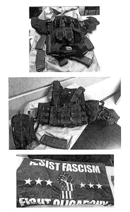 The suspects fled the scene, but all were later arrested. Subsequent searches turned up two AR-15s in the area, as well as 12 sets of body armor, spare magazines, rattle cans of paint, and a flag (above). Somehow they just don’t seem to be MAGA Amish?