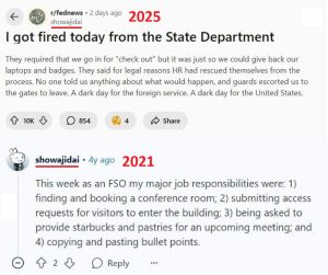 This image captures one of the reasons conservatives are cheering the release of many federal employees. The Reddit user lamented how the agency went about discharging federal employees. The Redditor followed up by describing this event as a dark day for the foreign service and for the United States. However, taking a trip down memory lane shows us an example of what taxpayers were paying this individual to do. Enjoy your weekend!