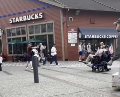 A self-appointed “stolen valor” detective decided to play Military Police at a Starbucks, confronting a wheelchair-bound street musician about his service patches. The confrontation escalated when the wannabe cop started literally ripping decorations off the musician’s wheelchair like some deranged fashion critic.