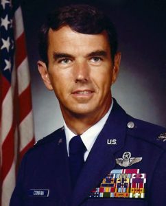 The President of the United States of America, authorized by Title 10, Section 8742, United States Code, takes pleasure in presenting the Air Force Cross to Major Philip J. Conran, United States Air Force, for extraordinary heroism in military operations against an opposing armed force as Aircraft Commander of a CH-3E helicopter of the 21st Special Operations Squadron, 56th Special Operations Wing, Nakhon Phanom Royal Thai Air Base, Thailand, in action at a classified location in Southeast Asia on 6 October 1969. On that date, while attempting to rescue the crew of a downed helicopter, Major Conran’s aircraft was hit by intense hostile ground fire and he was forced to make a crash landing in the vicinity of the other aircraft. Once on the ground, he successfully evacuated his aircraft and assumed a major role in defending the crash site against an overwhelming hostile force until rescue was possible six hours later. Through his extraordinary heroism, superb airmanship, and aggressiveness in the face of hostile fire, Major Conran reflected the highest credit upon himself and the United States Air Force.