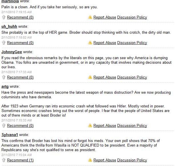 George Wallace? Hardly. But the most instructive part of the article isn’t in Broder’s piece, it’s in the readers’ comments a sample of which I’ve captured for posterity;