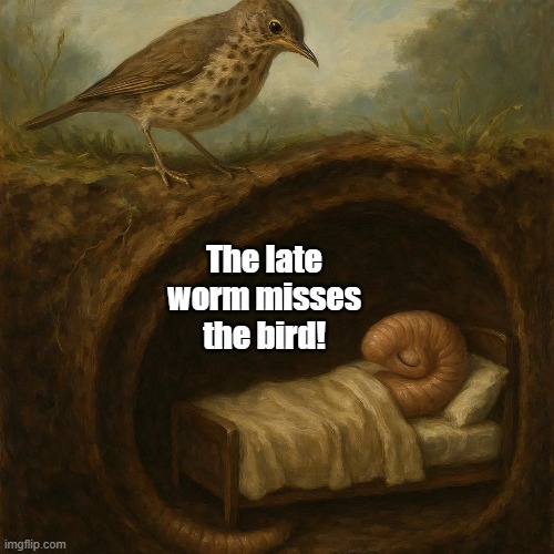 The worm’s words of wisdom: “Sleep late and you won’t get ate”!