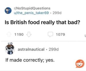 Yeah. Brits had Mad Cow Disease. I still can’t donate blood because of that kerfluffke.