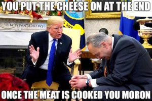I would add to the Schumer/Trump meme: [“You put the cheese on at the end … when the meat is cooked”] …