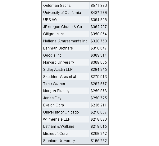 Jonn wrote: For the record, here are Obama’s largest donors as of May 25th from Open Secrets.org;