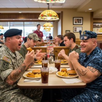 “The worst part isn’t even the stolen free meals,” Mike says, working through his third free entrée of the day. “It’s that these clowns make it harder for real vets. Some places now scrutinize everyone because Craig from accounting decided to cosplay as a Marine for free mozzarella sticks.”