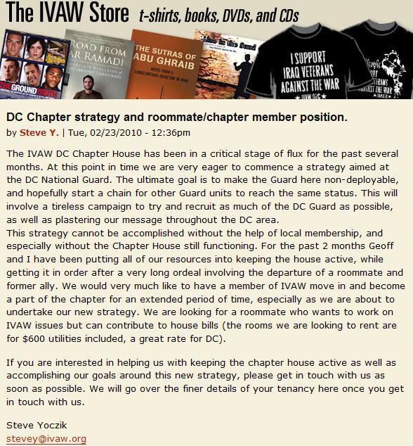 And $600/month for a room in DC is cheap? I lived a few blocks from the DC IVAW house and had a pretty nice and modern two-bedroom apartment for $1200 – you just need a room mate to share half the rent and you wouldn’t have to store your egg salad sandwich next to Adam Kokesh’s urine.
