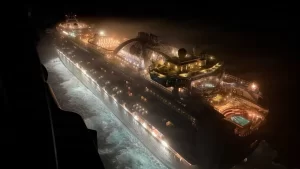It was the middle of the night and a heavy layer of fog cut visibility, made worse by a nearly moonless night. The Ruby Princess was lit up, but flying out to it was tricky. The helicopter crew flew using night vision goggles, navigating the HH-60W through heavy winds to get to the ship in the early hours of Dec. 17. Photos shared by the California Air National Guard show the cruise ship’s light casting an unearthly glow through the fog.