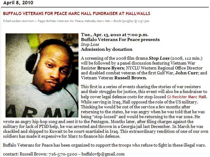 The last we heard about Stop Loss rapper Marc Hall, he was headed to Iraq for his court martial. He faced charges that he that threatened to shoot his chain-of-command in his little recording of a rap ditty. So if he’s going to Iraq, obviously, his civilian lawyers won’t be there. Can anyone tell me why his National Lawyer Guild counselors would need to raise money for his defense?
