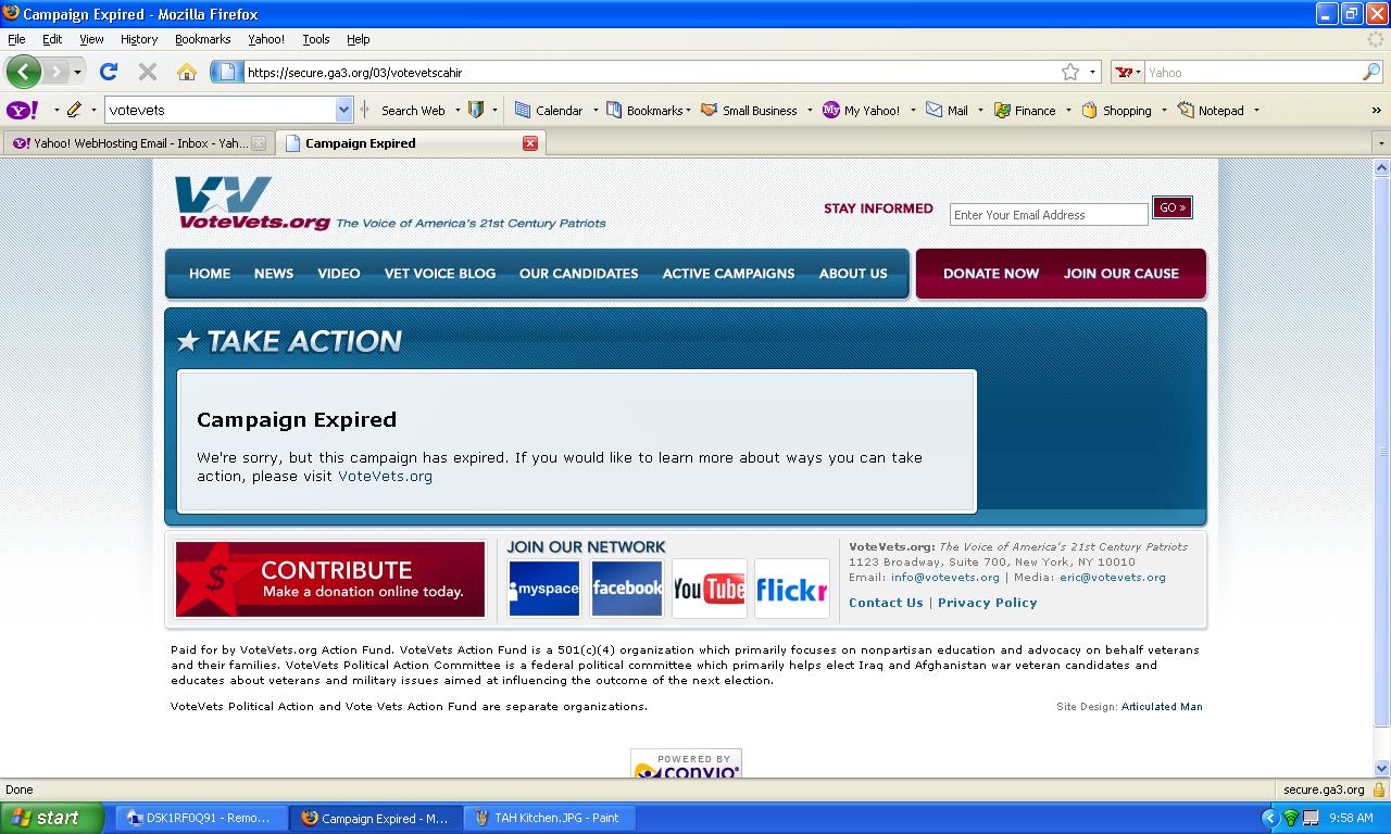 A reader who expresses his gratitude for our tenacious criticism of that MoveOn shill VoteVets writes to ask us why an expired campaign is considered a “Hot Topic” at Vote Vets. The front page of the Vote Vets website has a “Hot Topics” category, the first two are related to that intellectually vacuous ad VoteVets threw money at about “Clean Energy” will end all wars. The third is related to a “Vote Vets candidate” who was killed in Afghanistan by the name of Bill Cahir. It seems the only “hot topics” are those not related to veterans. Here’s a screen shot of the Bill Cahir donation page.