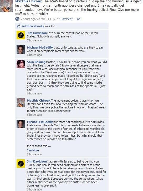 Apparently the IVAW Board has reversed itself, changed last month’s vote on whether or not to punish Matthis for his flag-burning escapades.