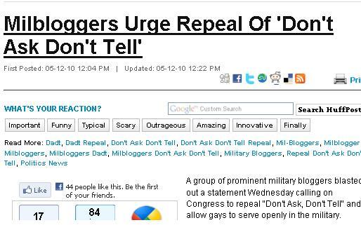 Coalition warefare at its finest, as if we didn’t learn the mistakes of Desert Storm. Some milbloggers, like Uncle Jimbo and McQ, are unquestionably supporting the repeal of DADT. Is that the crux of the statement, no, but what do you expect from the media?