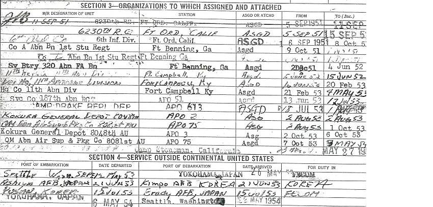 His only assignment to Korea was from July 18, 1953 – October 1, 1953 (the cease fire in the war began on July 27, 1953) and then he was assigned to Japan until May 1954 when he returned to the States. By the looks of the units, he was a rigger or at least assigned to rigger units.