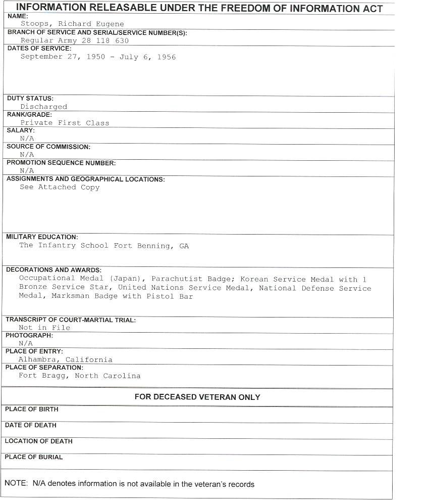The folks at POW Net submitted a FOIA for us and it seems that Stoops ended his six year stint in the Army as a Private First Class (not a Sergeant First Class like in the photo). It appears that he was indeed a paratrooper in the 11th Airborne Division and 187th Regimental Combat Team, but in HQs and Service companies. I don’t see any infantry assignments so toss out the CIB, too.