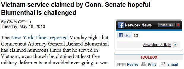 Now, I’ll admit that in the very next paragraph, the Post identifies Blumenthal’s party with a “(D)” after his name, but that’s hardly the equivance of spelling out “Republican” twice in the first ten words of the article, is it?