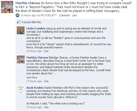 So basically, Matthis thinks that Martin Luther King Jr. was a “boot-lickin Uncle Tom” and justifies it by quoting Cleaver. I think Matthis just recently read Cleaver’s book and is trying to play it off like he’s held this belief for a long time. Why else would he bring it up this many months after the fact?