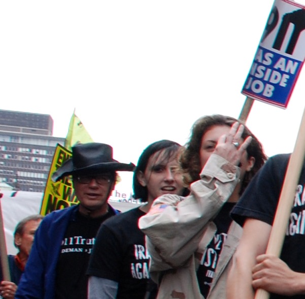 Marching with more than one Truther still clouds her integrity on this particular matter in terms of being a reliable and unbiased, non conspiracy theory prone witness. If you look, some dude behind her is wearing a truther shirt, which appears different from whoever is holding the sign.