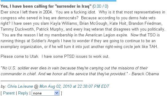 Let the record show that I have never called LeJeune a “fucking idiot” although ample evidence exists to support that contention. Nor have I threatened him. And I’ve never used my PTSD or any other illness as an excuse to physically assault anyone.