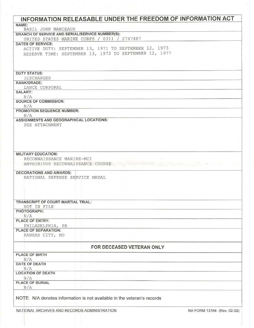 Last weekend, in response to several requests, I wrote a bit about Basil Marceaux, a candidate for governor in Tennessee who claimed he had been a Force Recon Marine. I doubted it given his demeanor at the time. We just got his records fromour friends at POW Net and it turns out he was indeed involved in Force Recon.