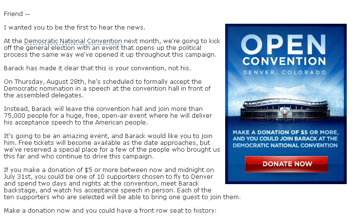 If you make a donation of $5 or more between now and midnight on July 31st, you could be one of 10 supporters chosen to fly to Denver and spend two days and nights at the convention, meet Barack backstage, and watch his acceptance speech in person. Each of the ten supporters who are selected will be able to bring one guest to join them.