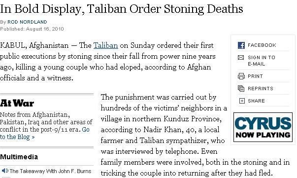 The New York Times shows their biases again this morning with the following headline in regards to the Taliban’s sentencing to stoning of a young Afghan couple who committed the heinous crime of eloping;