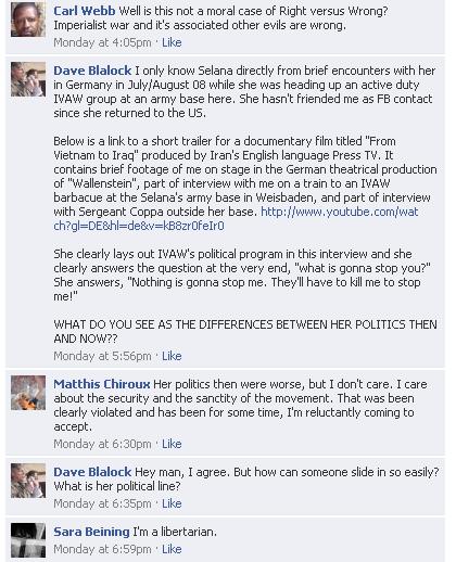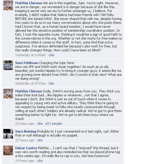 I think this witch hunt against Selena Coppa is about as slanted and Un-American as it gets. There is absolutely no evidence Selena compromised the IVAW yet she is being savaged on heresay. This is not the first time my son has been involved in such behavior and I doubt the last. As far as security you dolts are using FACEBOOK and assuming your posts are secure. All it takes is one FACEBOOK backdoor and every and any post, by anyone is public. Come ON guys walk your talk, FACEBOOK security is a myth and you are pulling a Josef Stalin on Selena. Unglaublich!