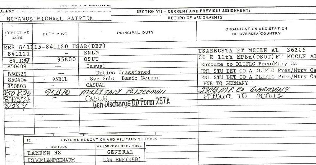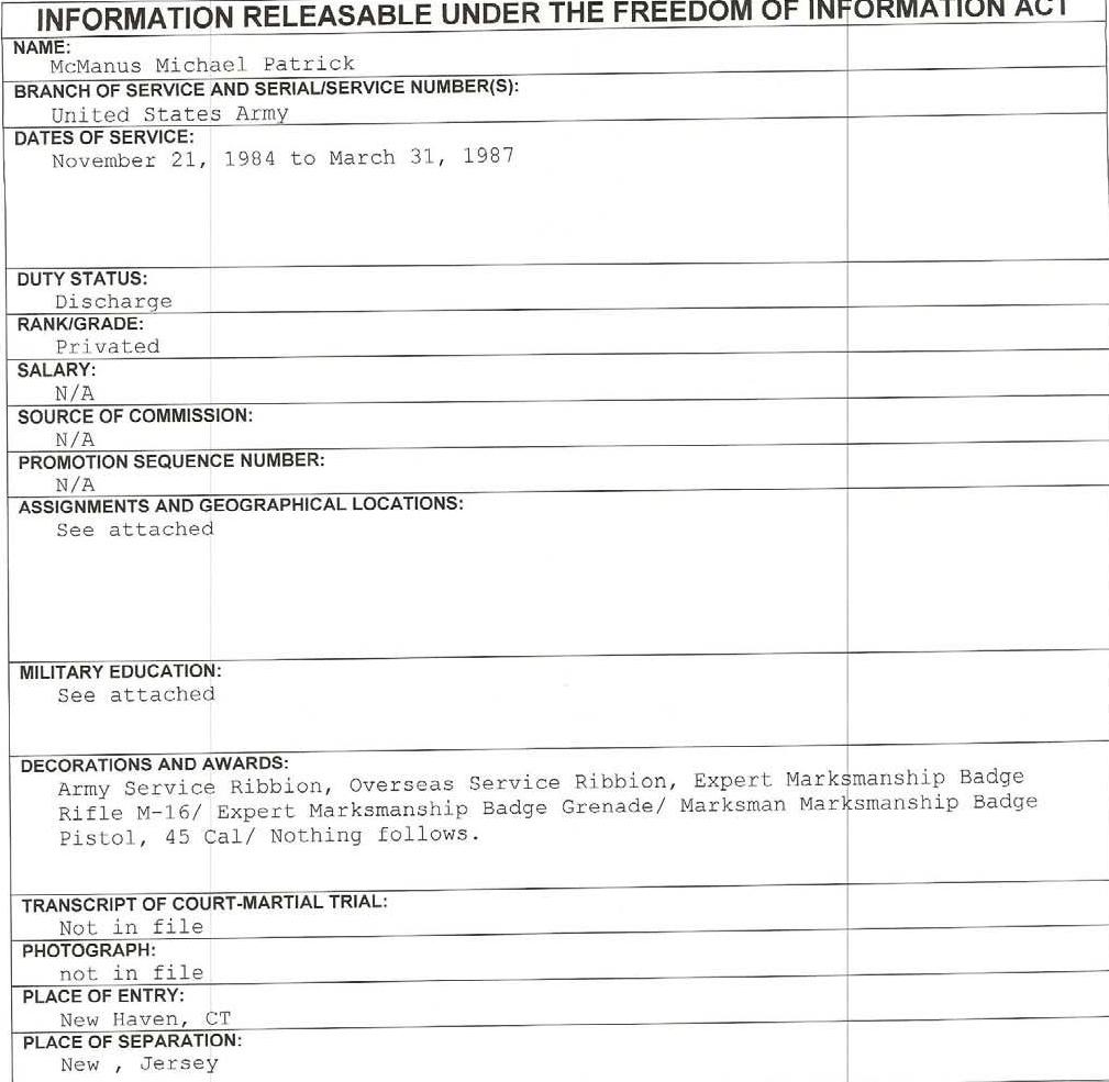 Well. it only took seven months (so much for your “48 hour turn over”, Matthis), but POW Network finally got Michael Patrick McManus’ military records from the National Personnel Records Center.