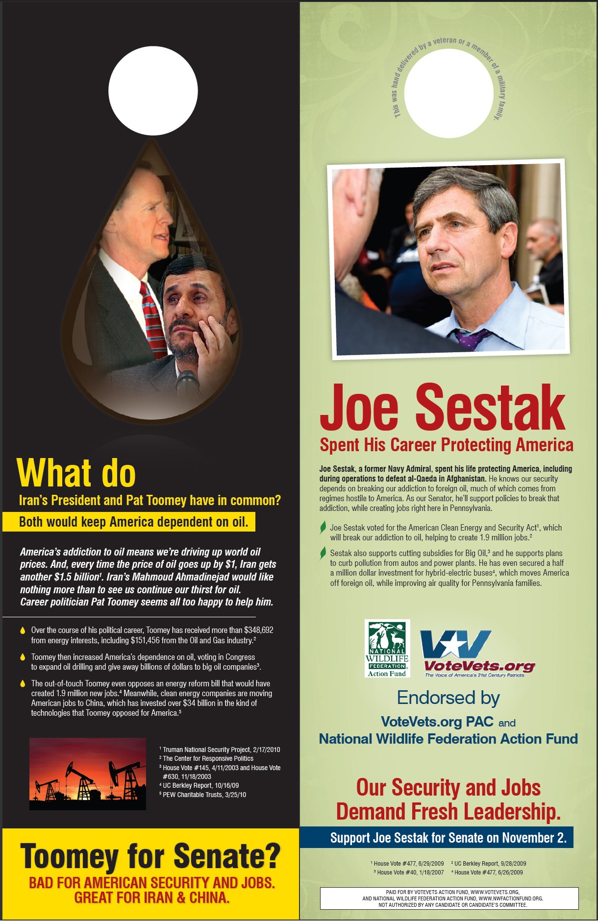 As they go door-to-door, the veterans and military family members will leave behind blistering door hanger lit pieces, featuring pictures of Sestak’s challenger, Pat Toomey, and Iran’s Mahmoud Ahmadinejad side by side, and one that asks whether Pat Toomey puts Wall Street above our troops.