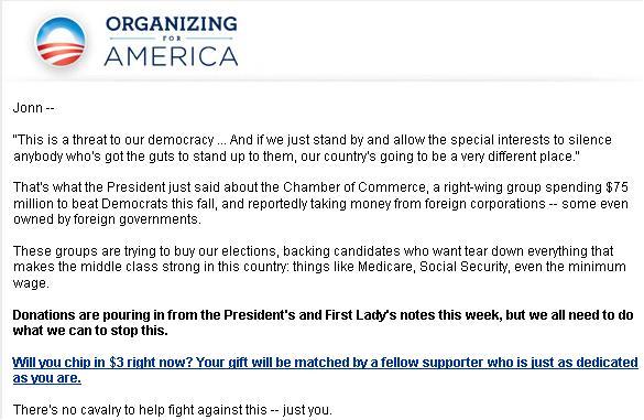 I got the following letter Friday about the new national security threat – the Chamber of Commerce which has given money to Republican candidates (oh, they’ve given to Democrat candidates, too, like Joe Manchin). The Organizing For America crowd, which operates under the auspices of the Democrat National Committee, is stirring up those of us who can’t figure out how to turn off the emails;