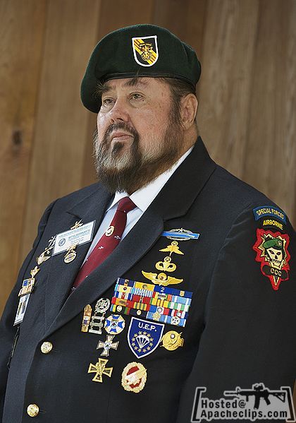 Whiskey Tango Foxtrot! This guy is all f’d up. A Bronze Star next to the Vietnam Service Medal but below what looks like NATO Service ribbons and a bunch of stuff I can’t ID. SF/Airborne/CCC. What is the U.E.P. patch he has on? Where do you start with this guy. Again, couldn’t just be an 11 Bravo. He may have all the high speed stuff on but at his size he is for sure “high drag” also. I really like the red tie with the uniform or suit coat he has all that on. I am LMAO first thing in the morning. “I love the smell of POS first thing in the morning…smells like…ass clown turd sucker.”
