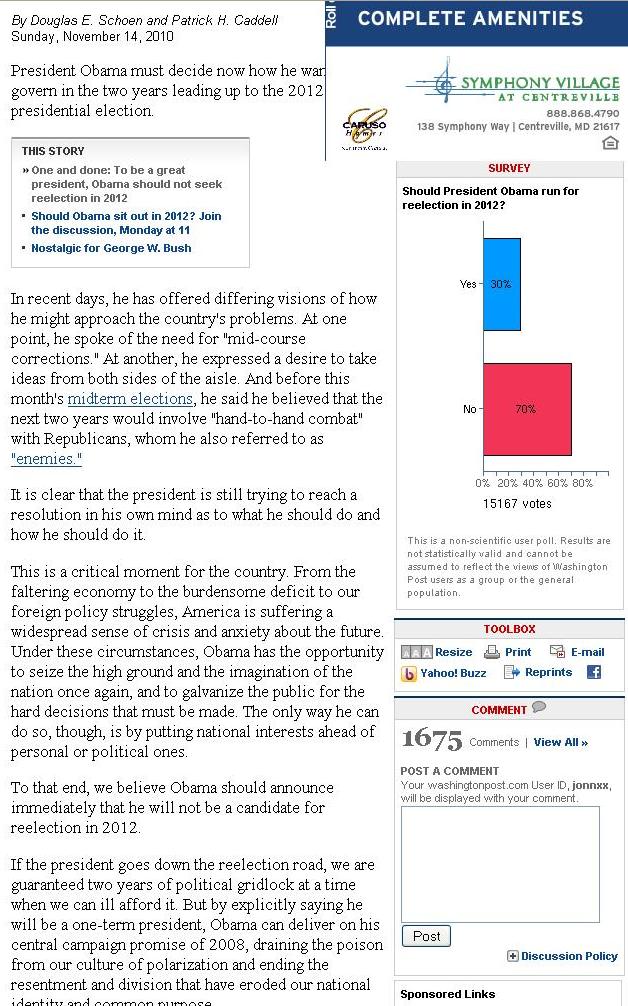 This story has been up on Drudge and flying around the internet for a few days, but it’s a call from some Democrat pollsters on Washington Post for Obama to announce that he’s only occupying the White House for one term. here’s the screen shot. Notice the poll in the side;