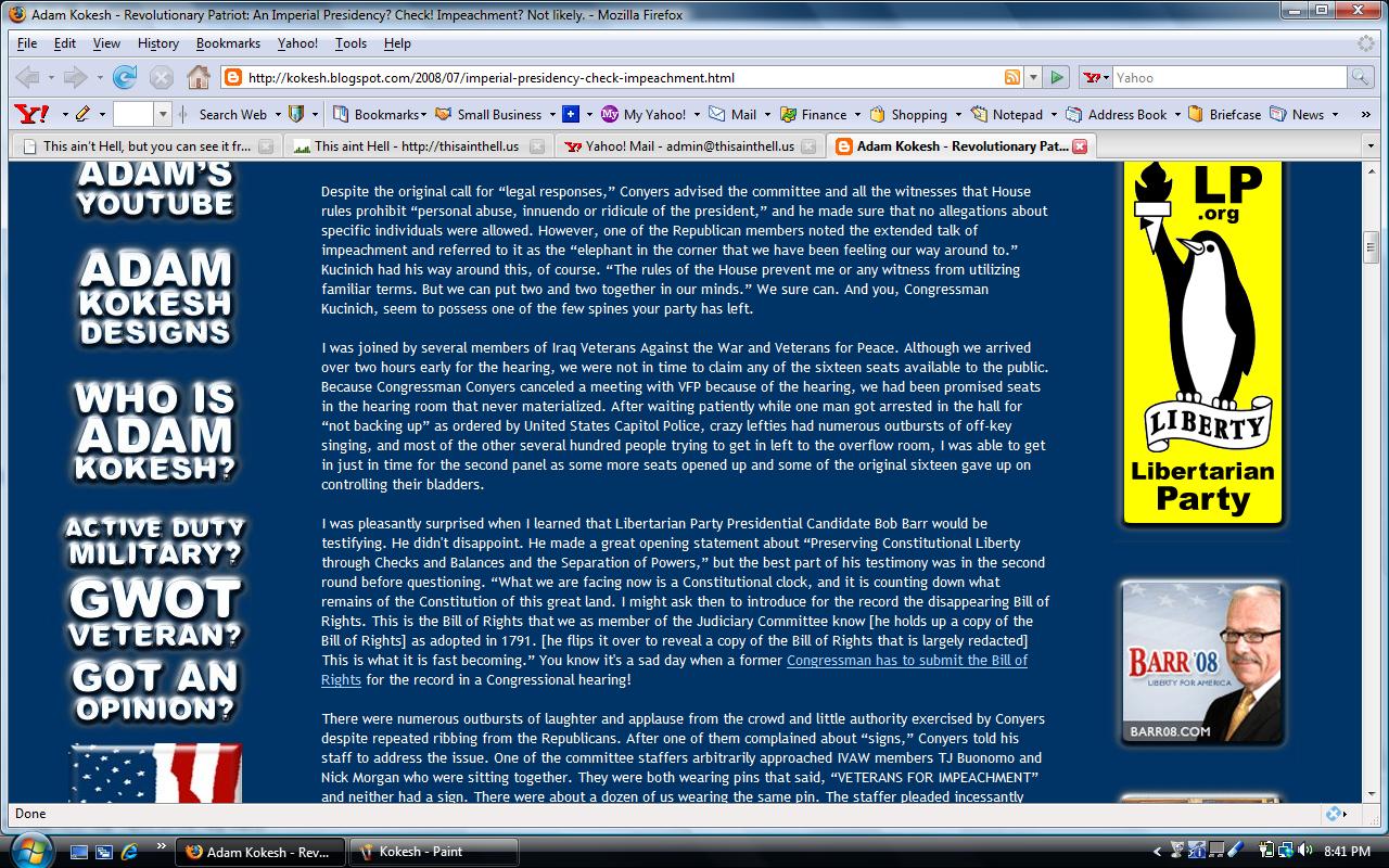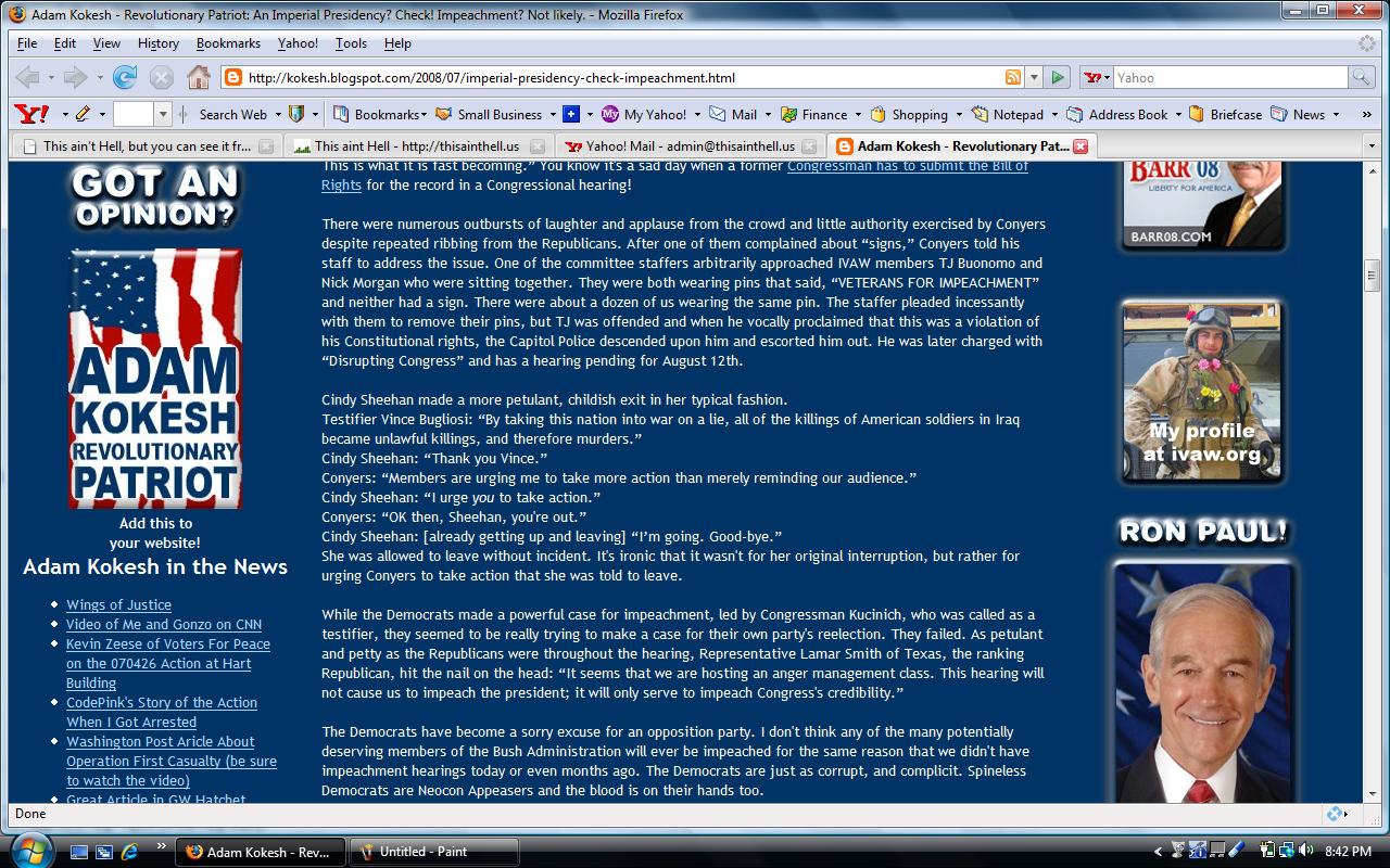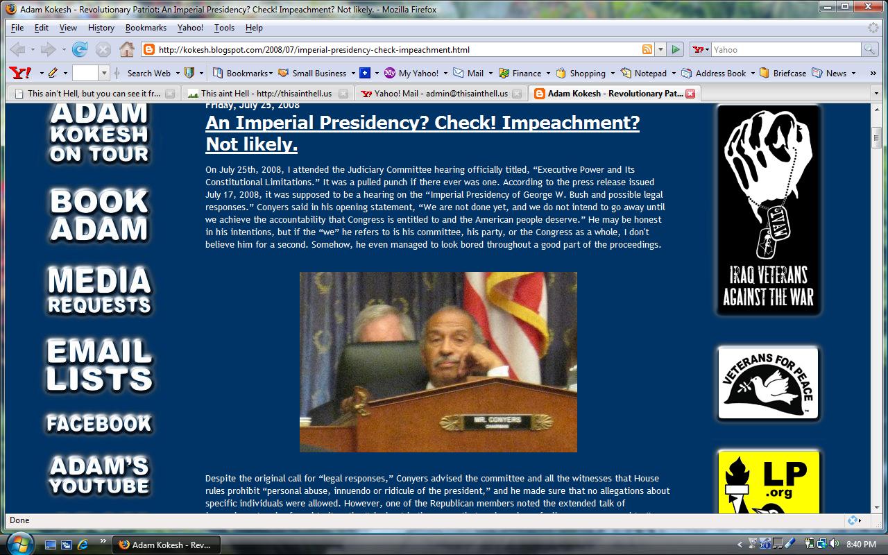 Raoul emailed me a link to IVAW’s Adam Kokesh’s blog (which I won’t link – you can Google it) where Adam reports on the impeachment hearing in Congress yesterday. As expected, it was nothing but a good bit of theater starring Dennis Kucinich, Bob Barr and Cindy Sheehan.