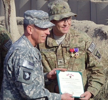 Yesterday in a very small combat outpost in Afghanistan the theater commander took time to pin a Bronze Star W/V Device and Purple Heart on a young NCO that I know very well; like the day he was born!