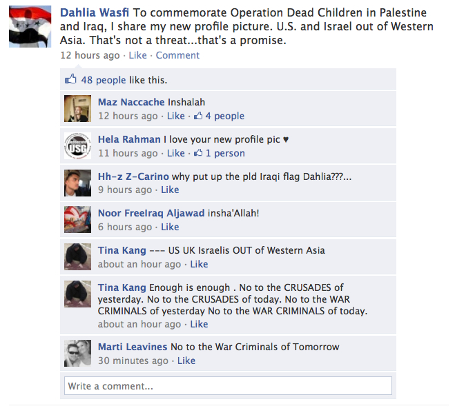 Of course, she’s referring to the flag in her Facebook avatar as if it’s some brave statement. The flag is Iraq’s Saddam Hussein-era flag. Obviously, Wasfi, whose family fled Hussein’s Iraq when she was a child, misses the Iraq she never knew. And what the old Iraq flag and the old Iraqi oppressor has to do with Israel’s war against Hamas in Gaza two years ago is too “scary smart” for me to figure out. I doubt any of the 48 people who “liked” her vacuous statement could explain it either.
