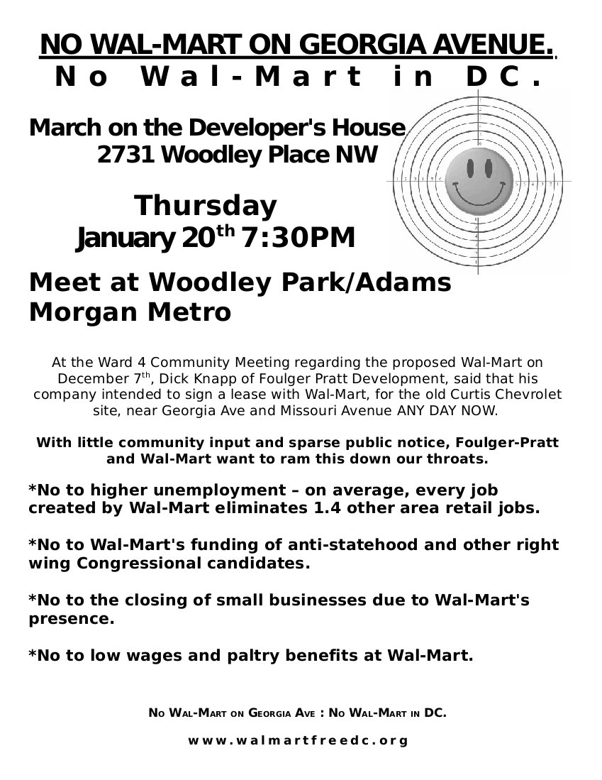 Old Trooper sends us link to an article on Townhall in reference to a protest that union activists are planning in front of the home of WalMart developer Dick Knapp who is about to sign a deal with WalMart at a recently defunct Chevy dealer several blocks from Walter Reed across the street from Metro Police’ 4th District Station.