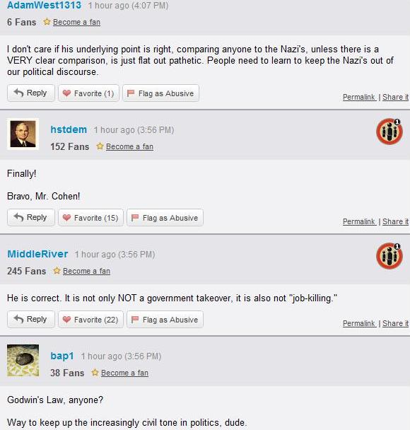 But anyway, HuffPost readers seem to be torn over the proper reaction, which can be heartening, if most of the commenters weren’t cheering Cohen. A fair and balanced sample, in the interest of the new tone;