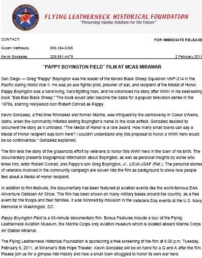 A young novice film maker and former Marine, Kevin Gonzalez, read our discussion about the phony member of the Black Sheep squadron and invited us all to San Diego to watch his first project entitled “Pappy Boyington Field“, a story about veterans getting Boyinton’s hometown airbase named for him;