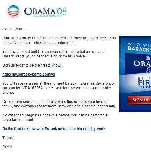 I guess that’s the reason she’s been kept under wraps the last few weeks…so she can learn what it is she says that pisses people off. Washington Wire posits that Clinton speaking the second night negates the rumors that she’ll be the VP candidate since the VP is scheduled to speak the following night…so I guess that’s good news. Probably the best news we’ve had all year from the Democrats. If you’re really worried about who he’ll pick, the campaign is offering a chance to be the first to know (along with several million other people);