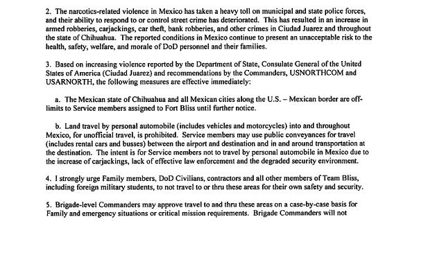 Yeah, that’s why in addition to Ft Bliss, soldiers assigned to Ft. Huachuca also are forbidden to cross over, not sure about the Marines in Yuma, AZ or in California, but I would imagine they are just as cautious. I spent almost a month at Huachuca in November and they had reminders at recall formations especially on Fridays about going across the border or even to the towns on our side of the border. El Paso has had random bullets shot from across the border recently and while it may be relatively safe because of the high amount of LEO presence if you go out and away from the cities it is entirely a different story.