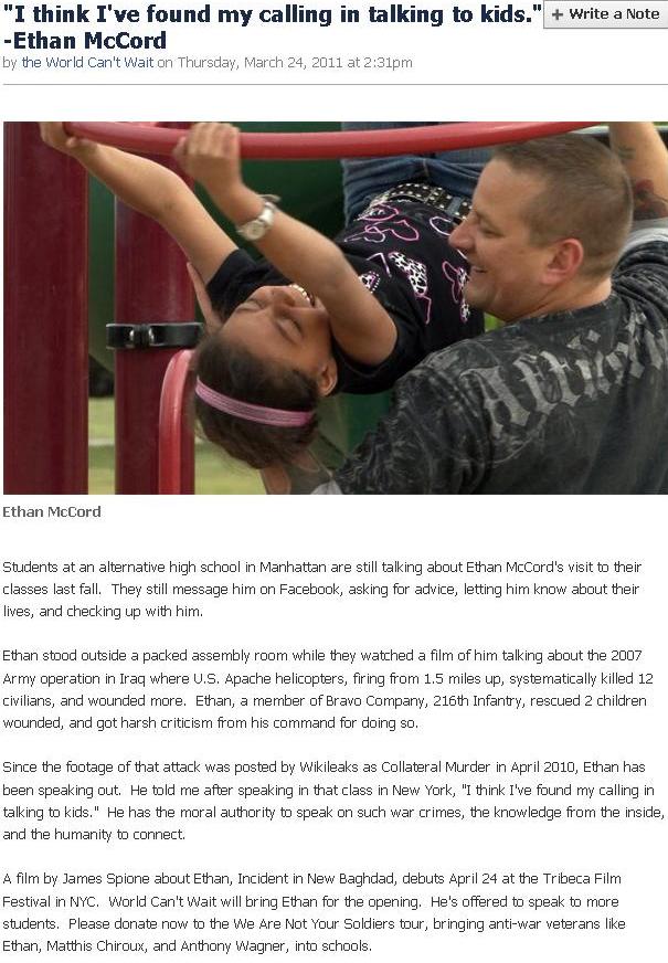 As I’ve written a few times, Ethan McCord, who was one of the soldiers on the scene during the now-famous “Collateral Murder” video (which was filmed four years ago). Now he’s a man on a mission to “explain” the video to your kids and school children like them with the help of the rocket surgeons at World Can’t Wait. Here’s a screen shot of WCW’s Facebook page where Ethan rejoices at his new-found occupation – teaching your kids;