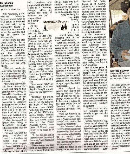 Apparently they ran the article in the print edition and it never made it to the internet edition. But apparently, it’s about this poor down-trodden fellow who joined the Army during the Vietnam War, became an infantryman, airborne then a Ranger and made Sergeant all before he was 18. Then the Army shipped his studly ass straight to Vietnam on his 18th birthday, February 20, 1969 and he didn’t leave until November 5, 1973 – that’s one long-ass tour, brother. He said he was assigned to the 5th SFG and attached to 173rd. (Sorry you guys from 1st Cav, I guess he didn’t think enough of you to make his story include you).